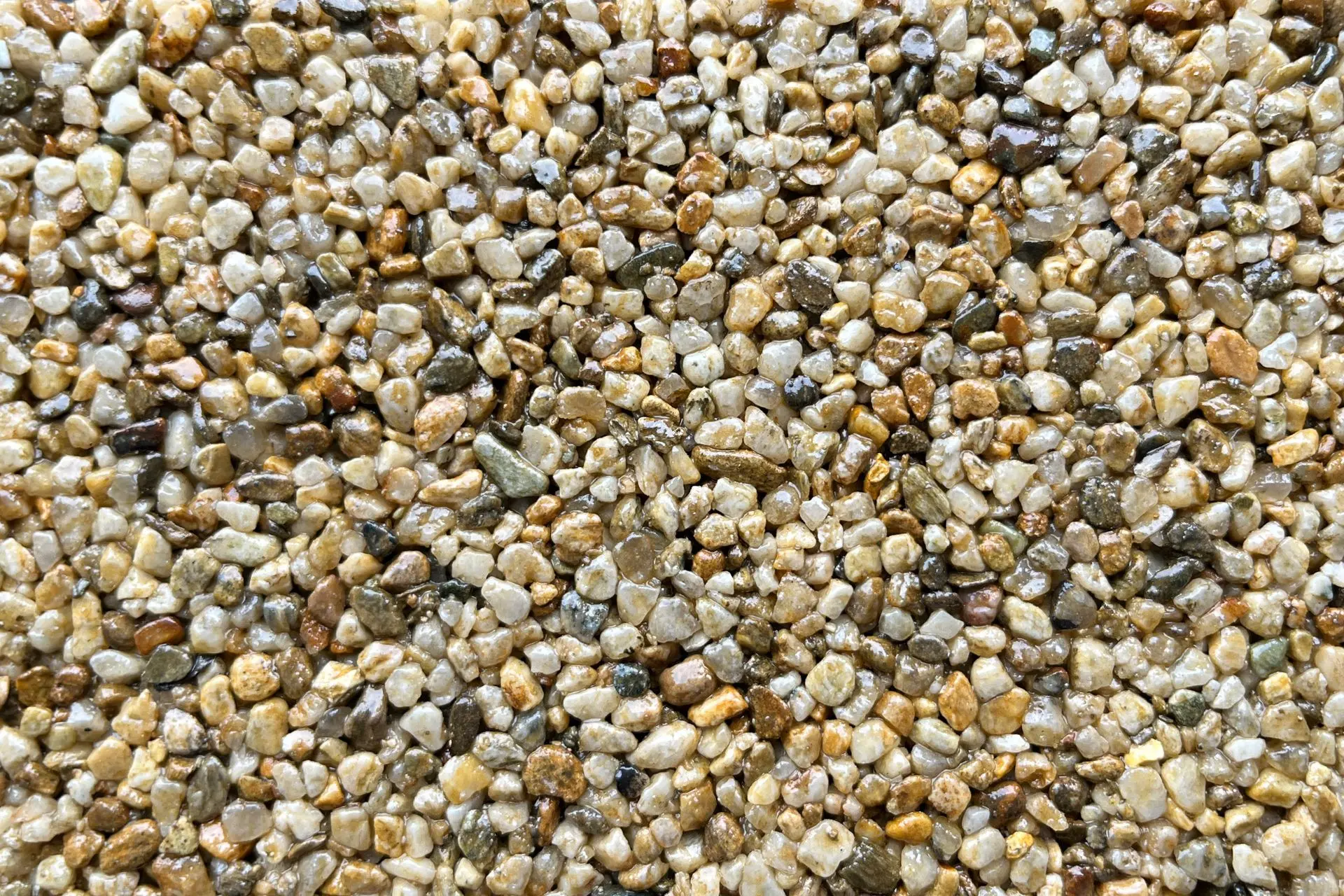 Sagrada Familia – Een warme en levendige grindmix die doet denken aan een zonovergoten kustlijn. De combinatie van honingkleurige, beige en witte steentjes creëert een natuurlijke, harmonieuze uitstraling die elke buitenruimte een zachte, mediterrane toets geeft.